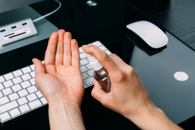 Ainda que esteja a cumprir a distância de segurança, há superfícies no escritório que devem ser frequentemente desinfetadas: maçanetas, interruptores, corrimões, telefones e computadores.